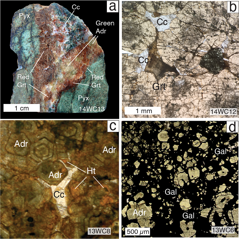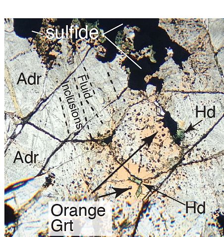 Fluid inclusions hosted in zoned andradite (green) with "grandite" (grossular/andradite; orange) rims, also showing hedenbergite and sulfide.