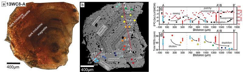 Detailed skarn garnet transects by EPMA, SIMS and LA-ICP-MS for major/minor element, oxygen isotope, and trace element measurements, respectively.